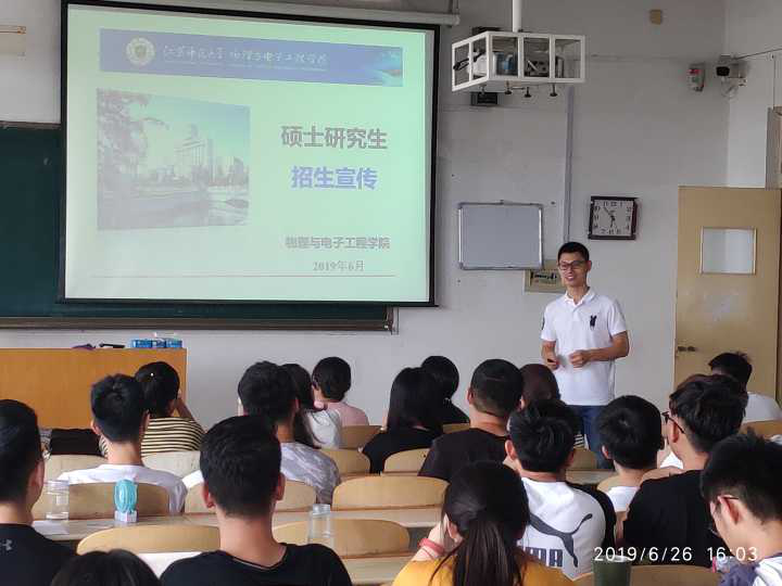 为使学生更好地了解大学生活的真正意义,充分调动新生学习的积极性和主动性,2019年6月26日,beat365在线唯一官网于求真楼4010教室开展了以“放飞青春梦想,书写青春华章”为主题的励志讲座,本次讲座特邀德州学院优秀校友、法国里昂大学博士、江苏师范大学石景明老师担任主讲,2016、2017级物理学、应用物理学全体学生以及部分电子专业学生参加了讲座。