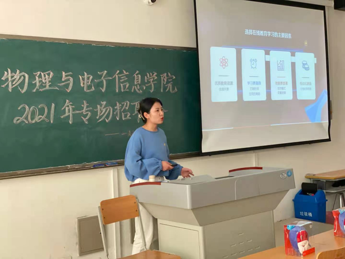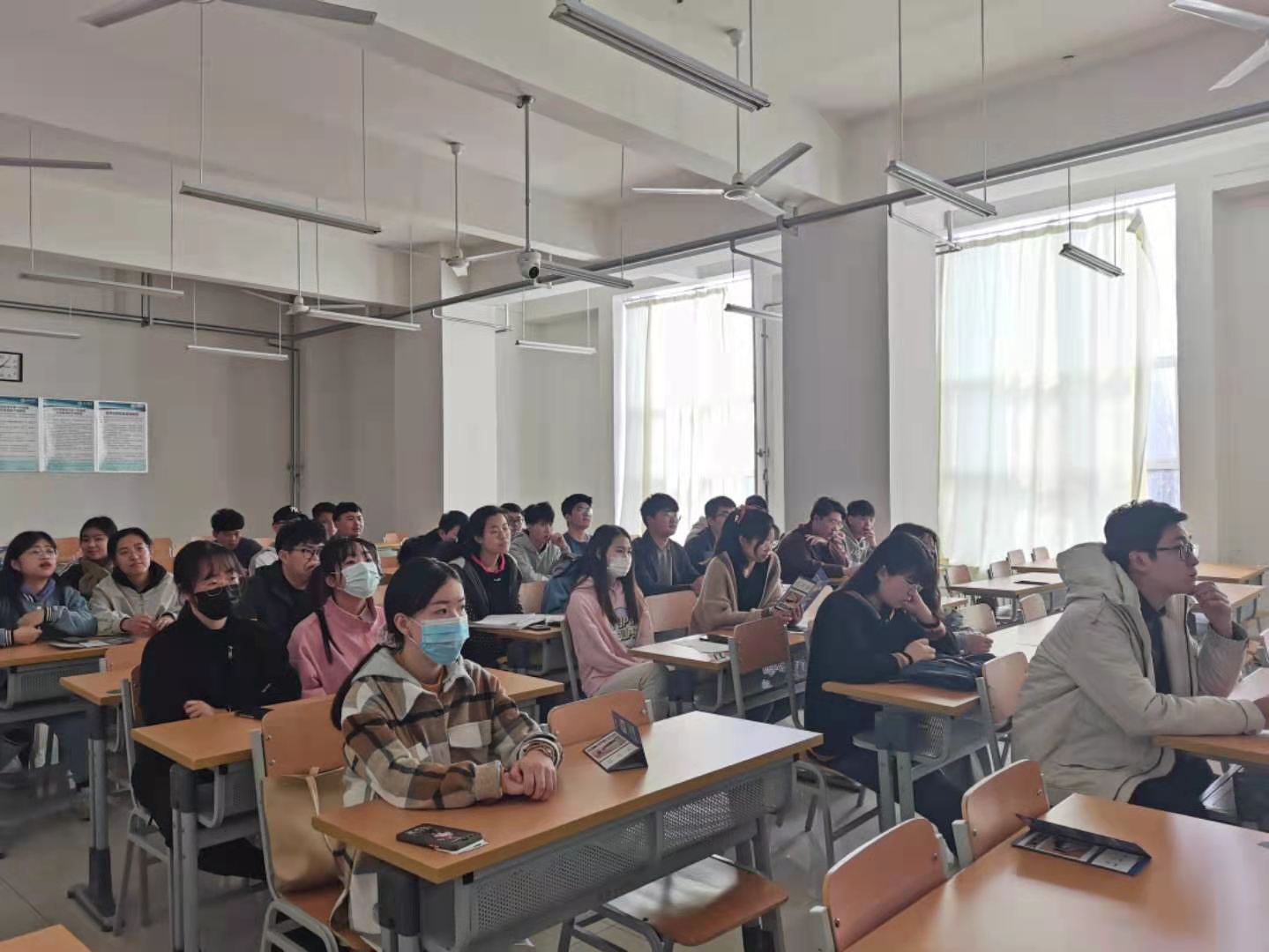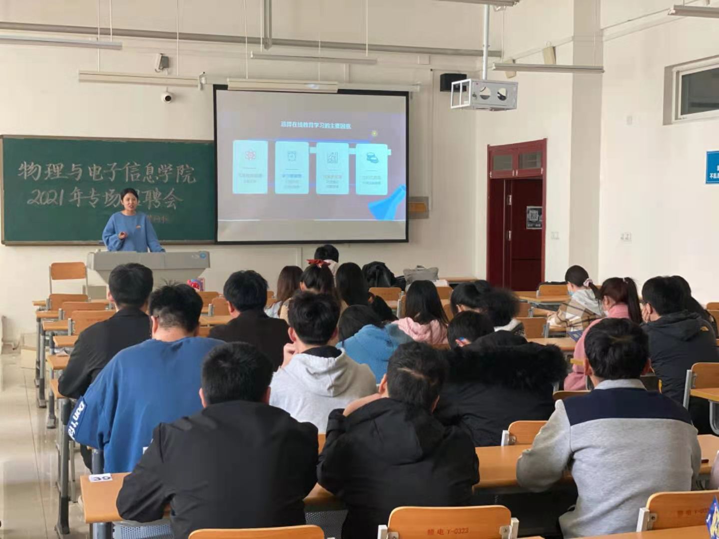 会上,招聘负责人介绍了公司详情、发展前景、岗位需求、岗位职责、岗位要求、薪资福利、办公环境等公司基本情况,并提出了招聘辅导教师的招聘意向。招聘负责人使用PPT,视频等活跃了当场气氛,通过抽奖问答等方式与同学们进行互动。会议最后,招聘负责人对投递简历的同学们进行了简单的面试。