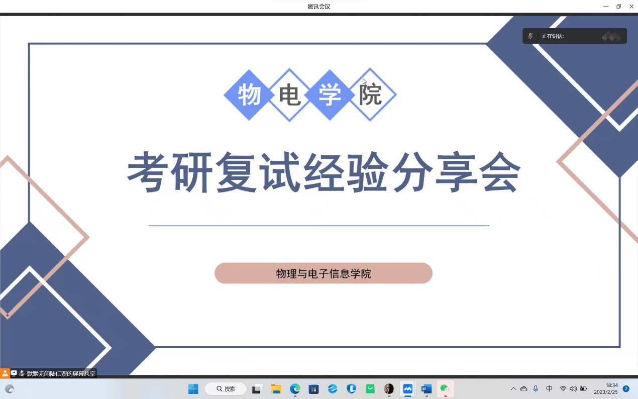 为促进学院学风建设,营造良好学习氛围,帮助考研学生做好复试准备,2月25日晚,beat365在线唯一官网召开2023年考研复试经验分享会。本次分享会以线上会议形式召开,参会人员为考研学生及优秀毕业生。