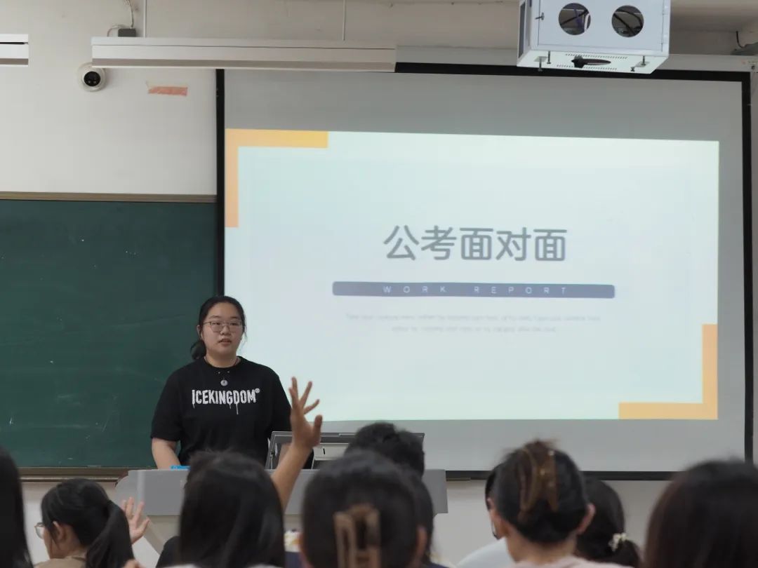 本次交流会分为分享和互动交流两个环节。在分享环节,学长学姐分别从公务员笔试和面试两个方面分享了自己的经验,为同学们梳理了考公务员和事业编的时间线,以及如何平衡二者。在互动交流环节,同学们就自己的困惑和关心的问题积极提问,他们热情细致解答,并鼓励同学们可以在学习之余进行运动,调整好心态,以便高效学习。