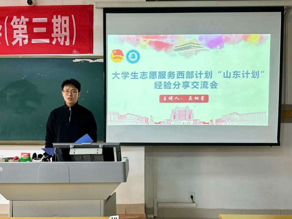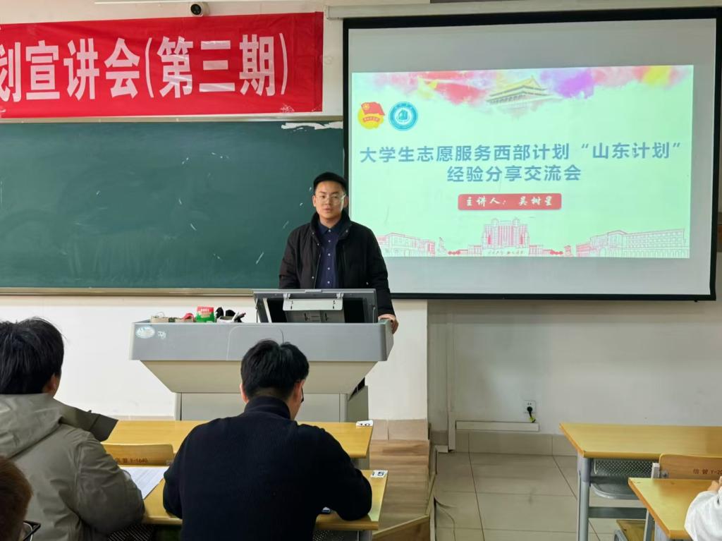宣讲会伊始,beat365在线唯一官网团委书记贾延琨老师简要介绍了大学生志愿服务西部计划的政策背景、招募流程及保障机制,并鼓励学生结合专业特长投身基层服务。本次宣讲会特别聚焦山东省大学生志愿服务乡村振兴计划,特邀山东省大学生志愿服务乡村振兴计划优秀志愿者、美术学院吴树星老师进行专项经验分享。作为该计划参与者,吴树星老师系统阐释了山东省大学生志愿服务乡村振兴计划的政策背景、战略意义、服务领域及报名通道,重点解析了基层服务岗位设置与专业适配性,帮助物电学子精准把握"专业+乡村振兴"的实践路径。宣讲会最后,秘书处于瑞娇同学精心策划并带领完成“风车时光邮筒:寄给未来的自己”,同学们在信笺上写下对未来自己的寄语或服务承诺。
