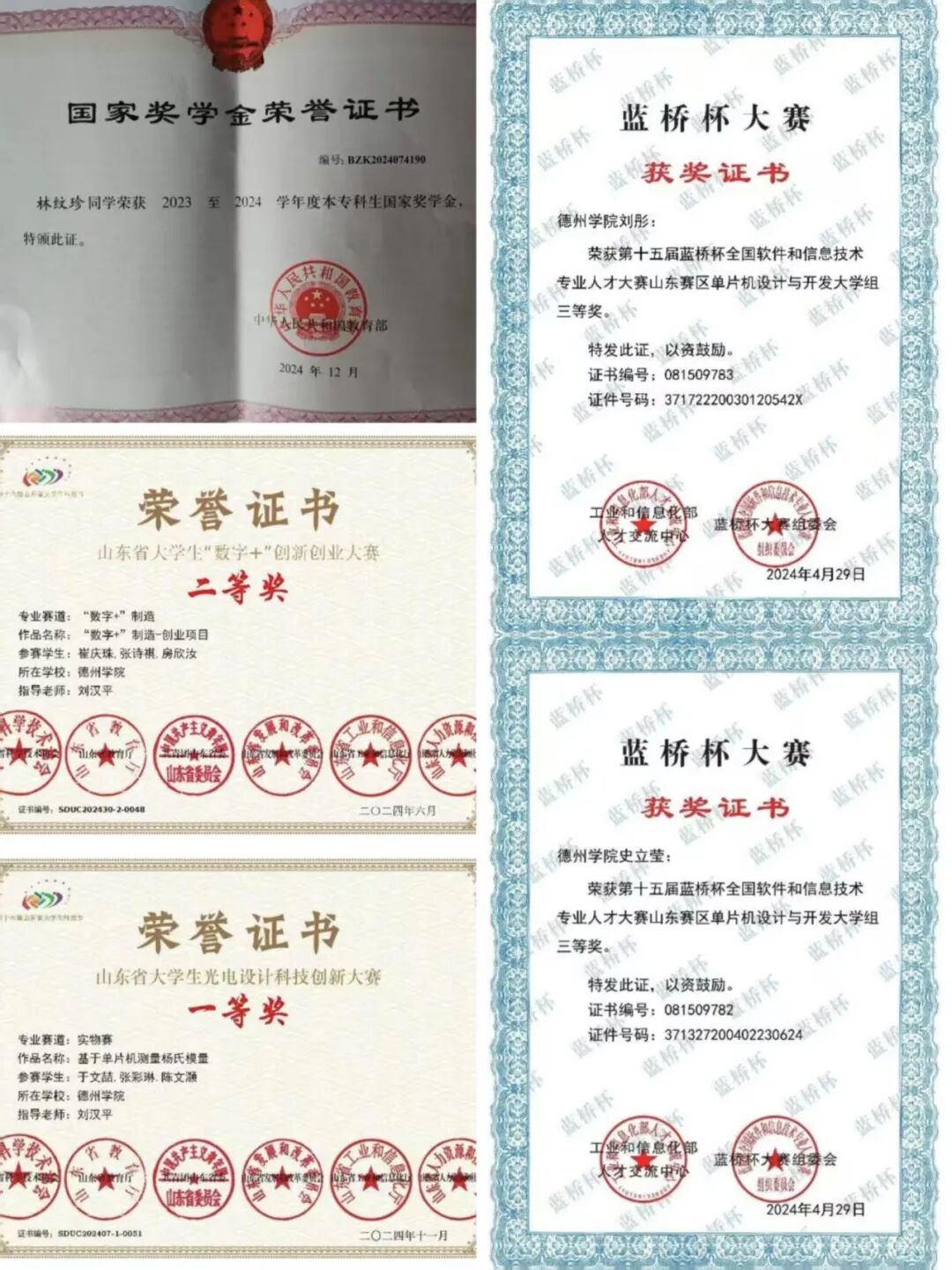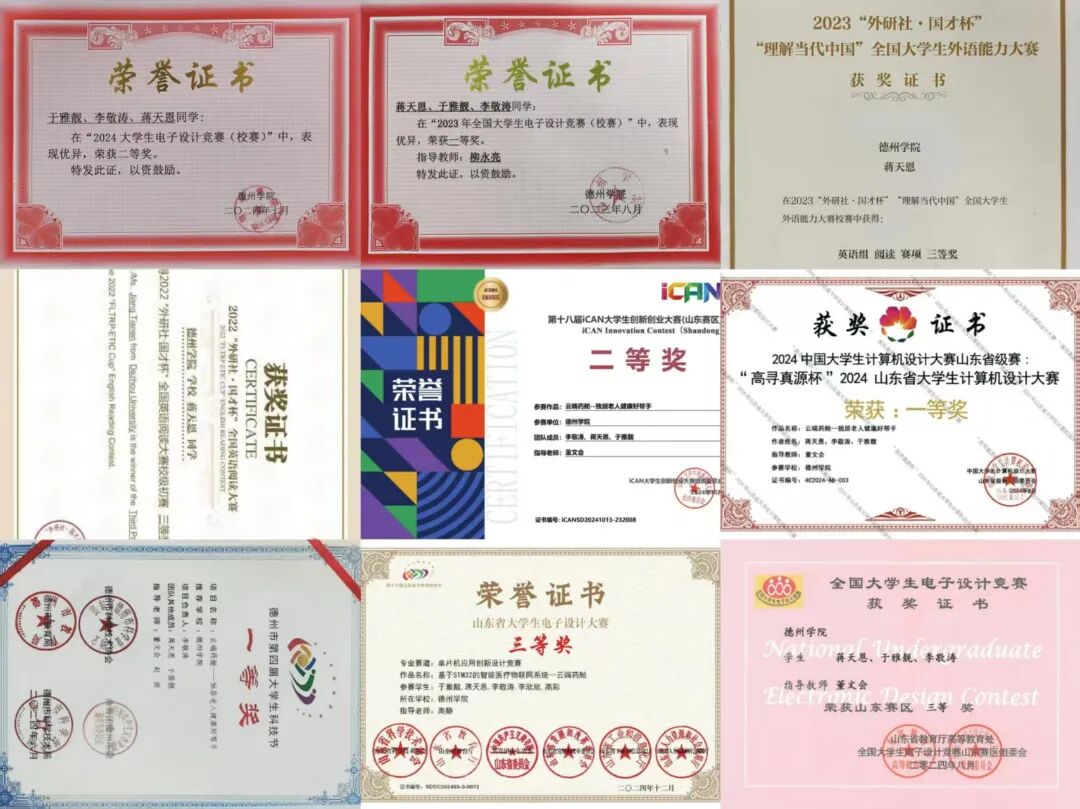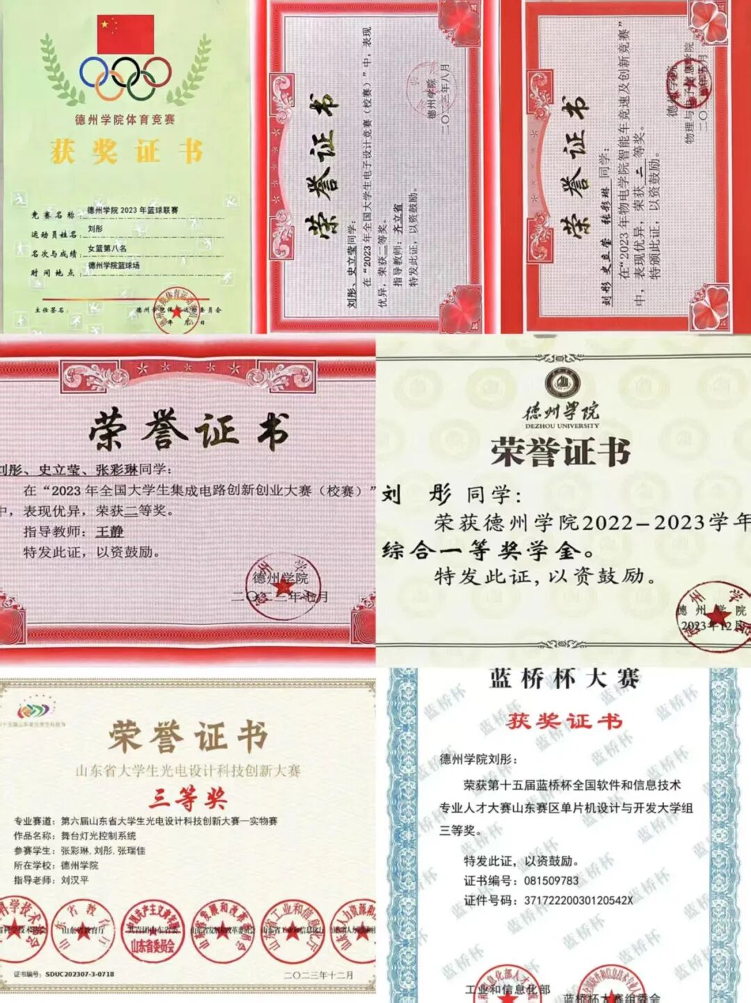 2023-2024学年学业成绩与综合成绩均位于专业第二名,平均学分绩点为4.07。曾获2023-2024省政府奖学金,德州学院综合一等奖学金,优秀共青团干部等荣誉称号;第十五届蓝桥杯单片机大赛三等奖,山东省光电设计科技创新大赛三等奖,2023年全国大学生集成电路创新创业大赛校赛二等奖,2023年全国大学生电子设计竞赛校赛荣获二等奖,德州学院 2023 年篮球联赛女篮第八名荣誉。