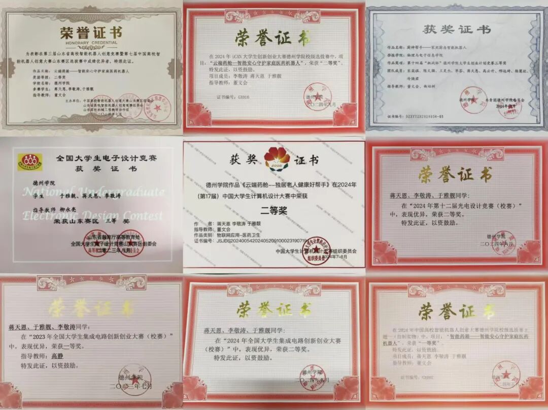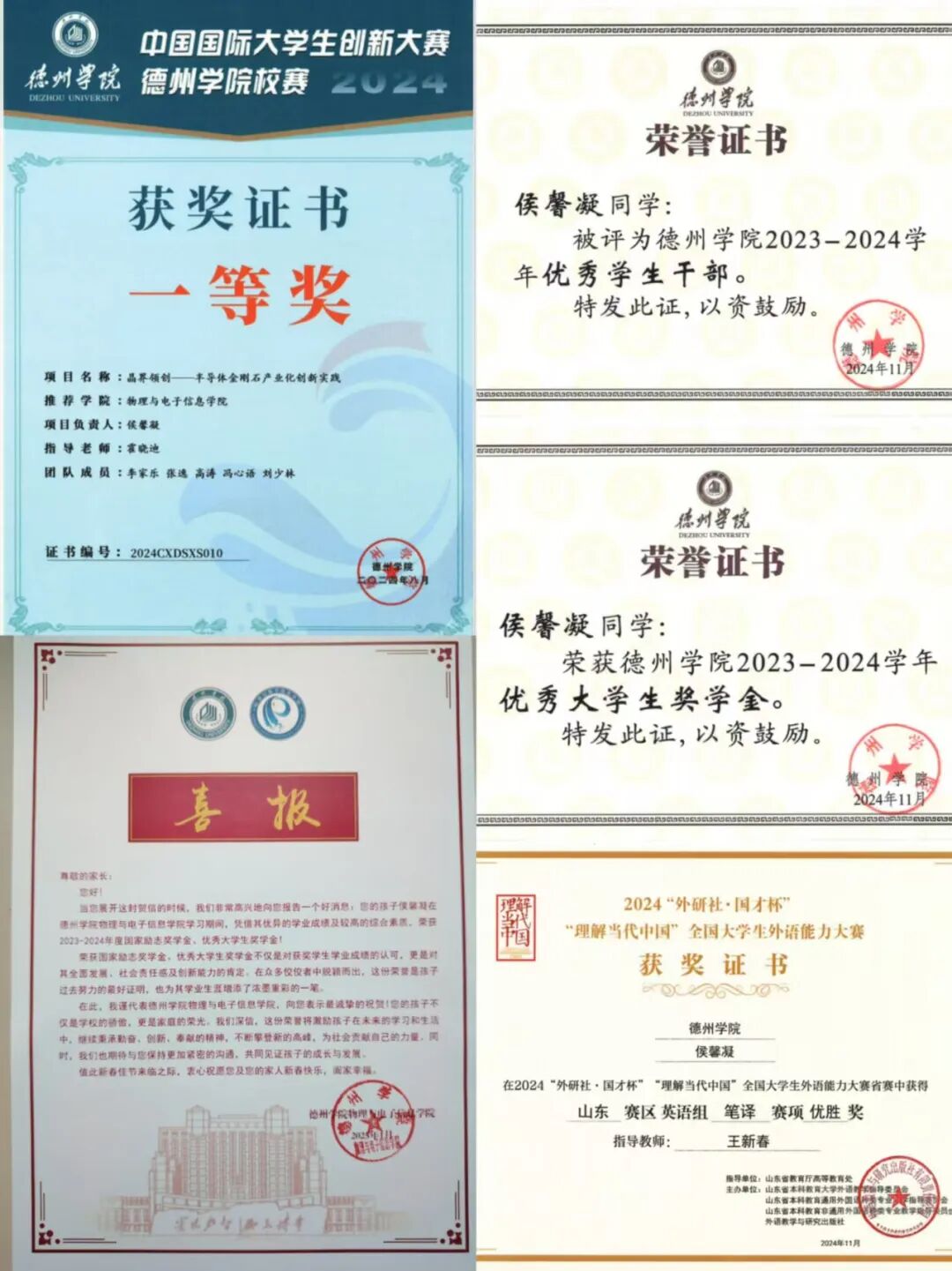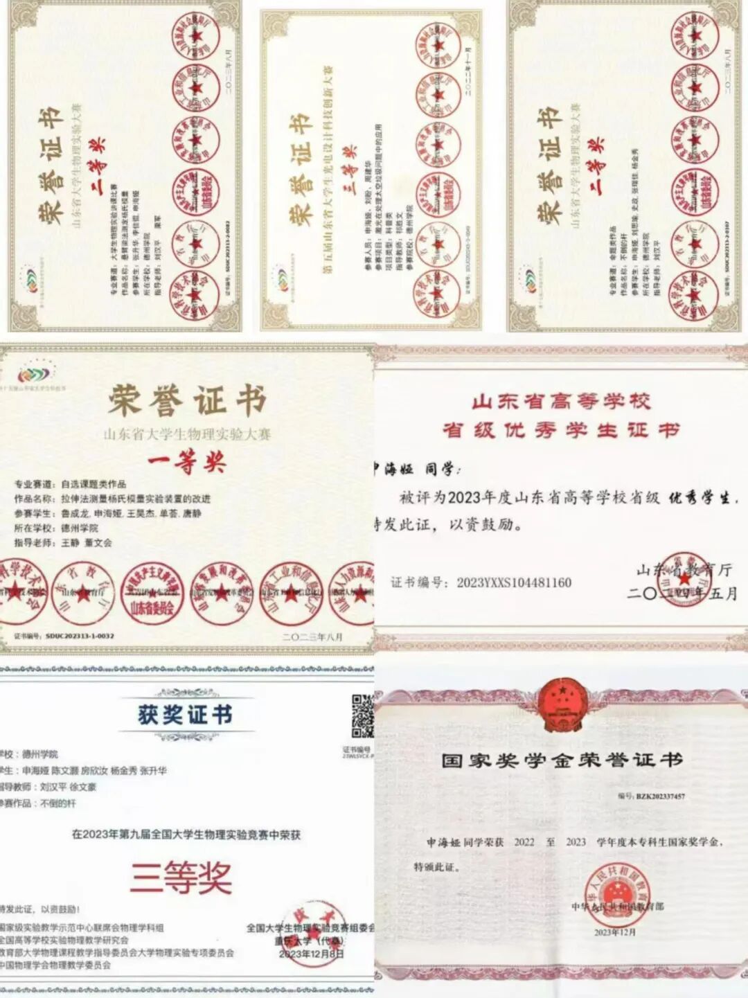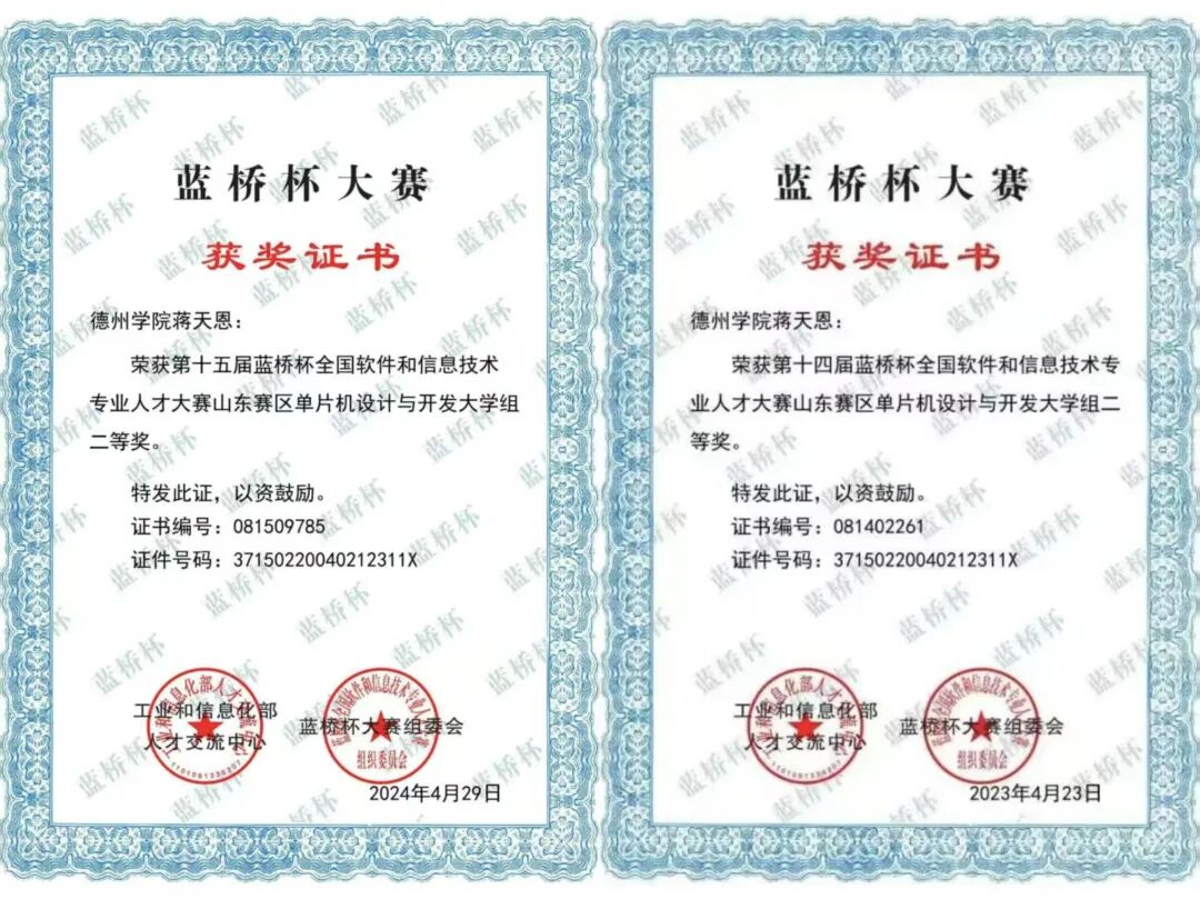 2023-2024学年学业成绩与综合成绩均位于专业第二名,平均学分绩点为4.07。曾获2023-2024省政府奖学金,德州学院综合一等奖学金,优秀共青团干部等荣誉称号;第十五届蓝桥杯单片机大赛三等奖,山东省光电设计科技创新大赛三等奖,2023年全国大学生集成电路创新创业大赛校赛二等奖,2023年全国大学生电子设计竞赛校赛荣获二等奖,德州学院 2023 年篮球联赛女篮第八名荣誉。