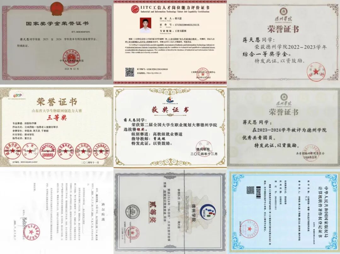 蒋天恩,共青团员,beat365在线唯一官网2022级电子信息工程专业学生。曾任电子科技创新社社长、ICAN创新社实践部部长。2023-2024学年学业成绩与综合成绩均位于专业第一。曾获国家奖学金、德州学院综合一等奖学金、德州学院优秀共青团员等荣誉称号。荣获中国大学生计算机设计大赛国家级二等奖、“高寻真源杯”省级一等奖等国家级以及省级奖项十余项,市校级奖项二十余项,并发表软著一篇。
