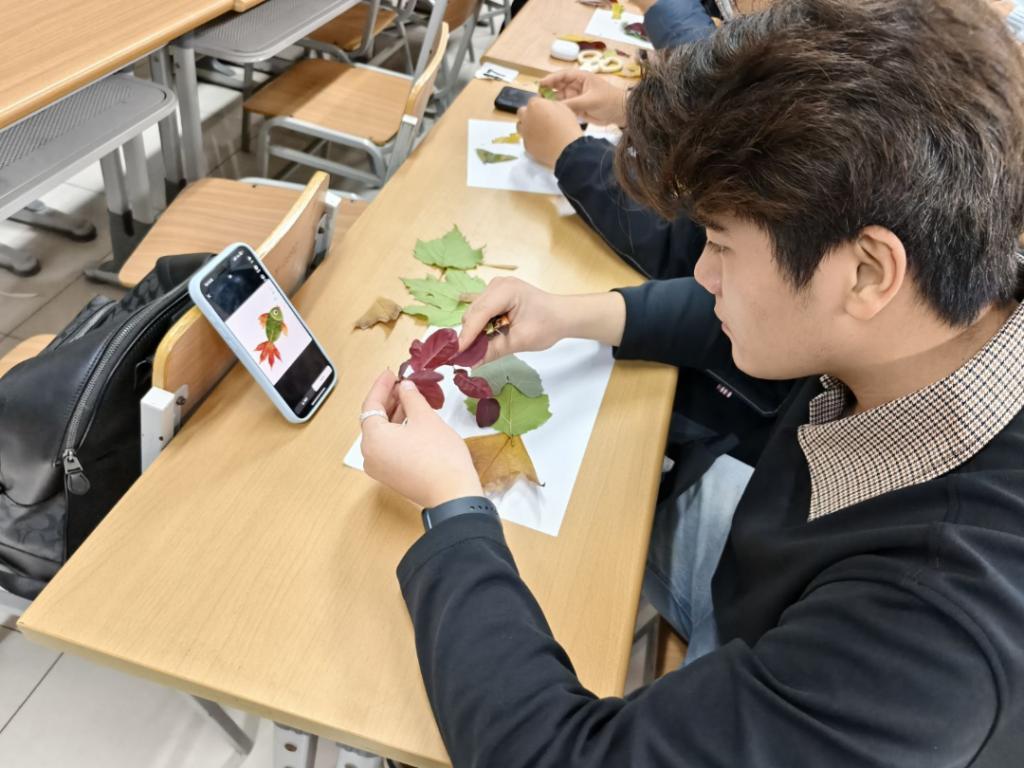 活动现场,主持人简要介绍了树叶拼贴的心理疗愈价值与创作思路,鼓励同学们借助自然素材释放内心情绪。同学们以小组为单位协作创作,在挑选树叶、拼接构图的过程中,既充分展现了创意巧思与动手能力,又在轻松互动中舒缓了身心压力,收获了满满的愉悦感。这些富有生命力的作品不仅形象生动,更承载着同学们对大学生活的无限热爱与对未来的美好憧憬。在作品展示与分享环节,同学们踊跃上台,分享各自的创作灵感与实践心得,彼此交流感悟、互相点赞,现场氛围热烈融洽,处处洋溢着温暖气息。