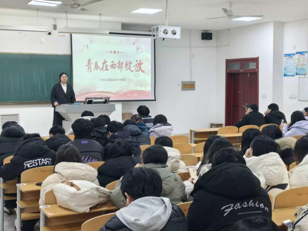 宣讲会上,学院党委副书记刘秀华围绕西部计划招募条件、服务保障、发展支持等核心政策展开解读,清晰阐释了志愿者服务期间享有生活补贴、医疗保障,服务期满后可享受考研加分、公考优先录用等优惠。她强调,西部计划为青年提供了成长成才的重要平台,学校与学院将为志愿者提供全方位支持,解除大家的后顾之忧,鼓励学子们把握机遇,到西部广阔天地实现人生价值。志愿者分享环节,马守健讲述了用知识与爱心助力基层教育发展的初心与收获;季心怡则畅谈了在西部基层治理与民生服务中的实践体会,传递了扎根一线、奉献担当的青春态度。两人的分享质朴真切,让在场学子直观感受到西部计划的价值与意义。
