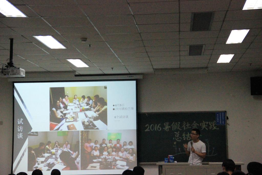 总结之后,各个社会实践小组依次展开了本组的宣讲活动,各个小组妙语连珠,语言独到精辟,向同学们充分全面地展示了本组的实践过程和丰富成果,博得了同学们的多次热烈的掌声,同学们也认真仔细地聆听了每个小组的宣讲,取得了较好的成果。