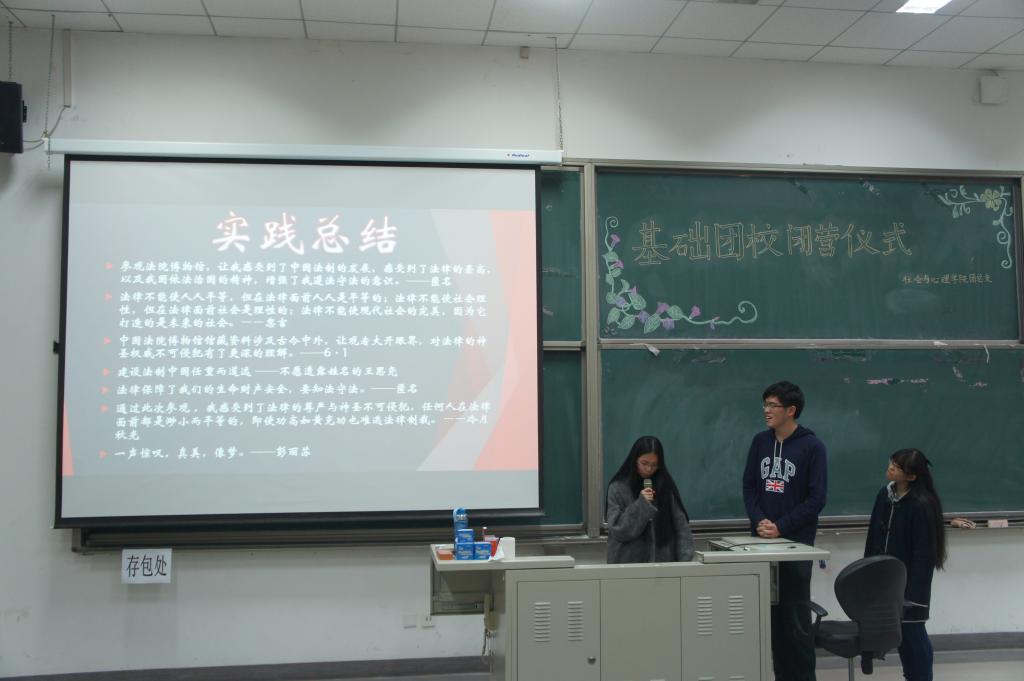 2016年11月18日,350vip8888新葡的京集团350vip8888新葡的京集团组织开展了“350vip8888新葡的京集团2016年基础团校闭营仪式”,旨在检验团校教学效果,展示对基础团校活动进行展示与总结。350vip8888新葡的京集团辅导员司晴老师、学生会主席刘祎同学、学生会副主席殷媛同学、团总支第一团副王晓蝶同学、团总支第二团副余佳明同学、芮+导师张诗然同学、芮+导师孙鹏宇同学出席了本次活动。