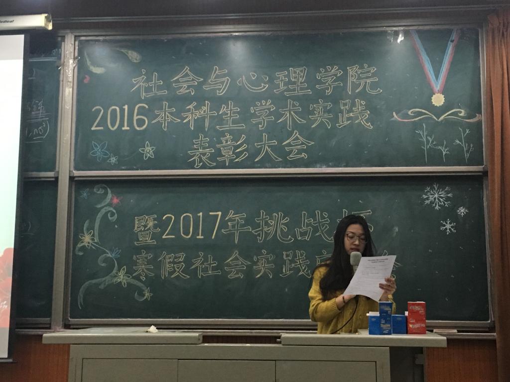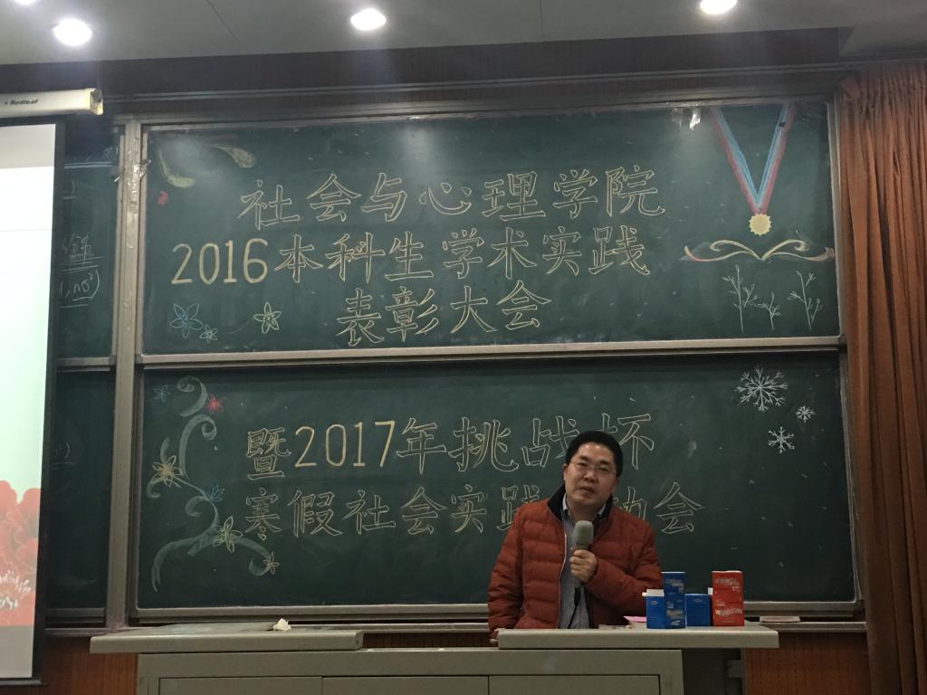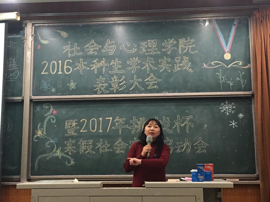 2016年12月23日,350vip8888新葡的京集团组织开展了“2016年本科生学术实践表彰大会暨2017年挑战杯、寒假社会实践启动会”,350vip8888新葡的京集团党委书记杨琼老师、副院长丁志宏老师、社会学系王建民老师、心理学系张红川老师,学院团总支书记胡博老师,辅导员司晴老师出席了本次会议。