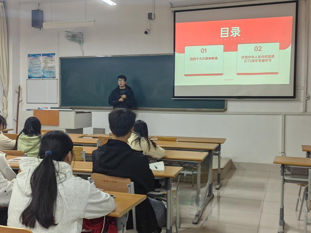 纪洪飞老师围绕团的十九大精神与庆祝新中国成立 75 周年展开专题学习。老师希望入团积极分子们能以理论知识充实自我,以实际行动践行红色精神,不断提高青年政治觉悟,积极向团组织靠拢,努力成为一名合格的共青团员。