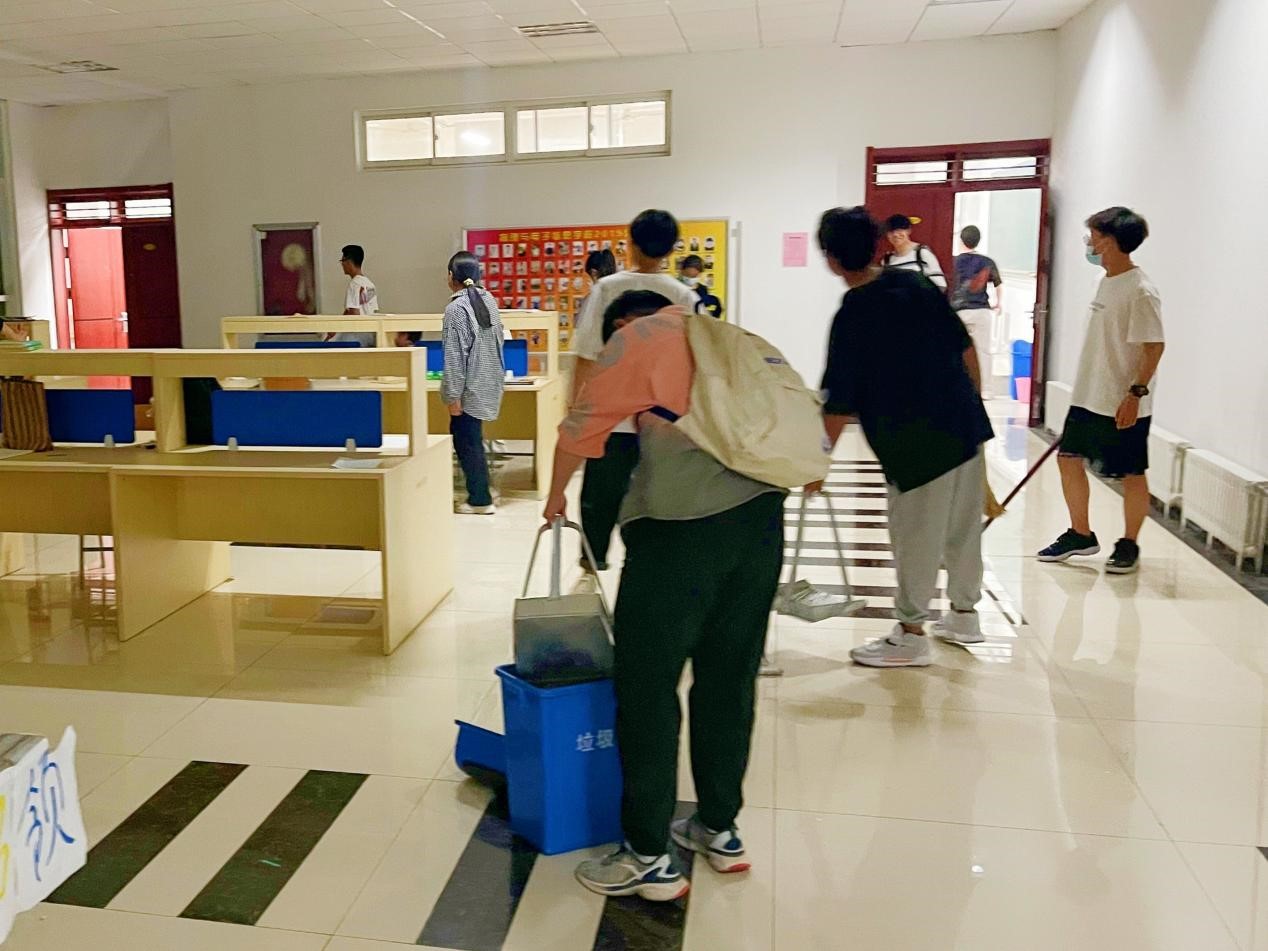 活动开始时,志愿者们按照既定工作安排,带好扫帚、拖把、抹布等卫生工具,在已划分好的卫生区域内,对地面、修读点桌面进行了整理清洁。在志愿者们的认真工作下,明理楼公共卫生区焕然一新。