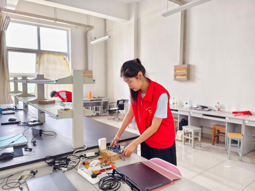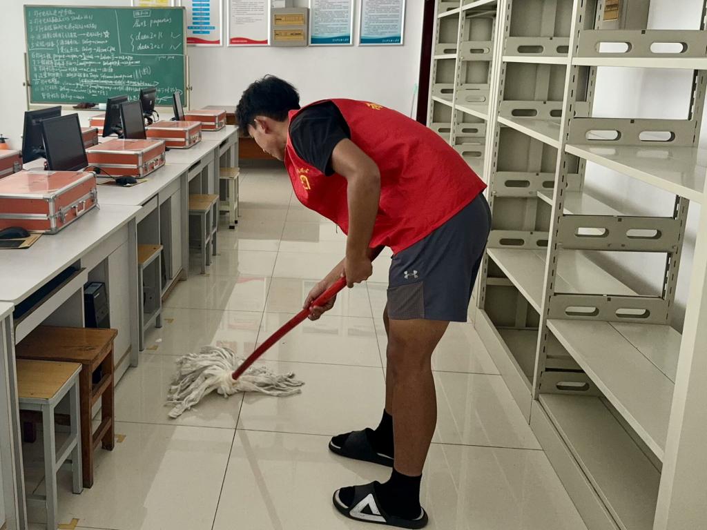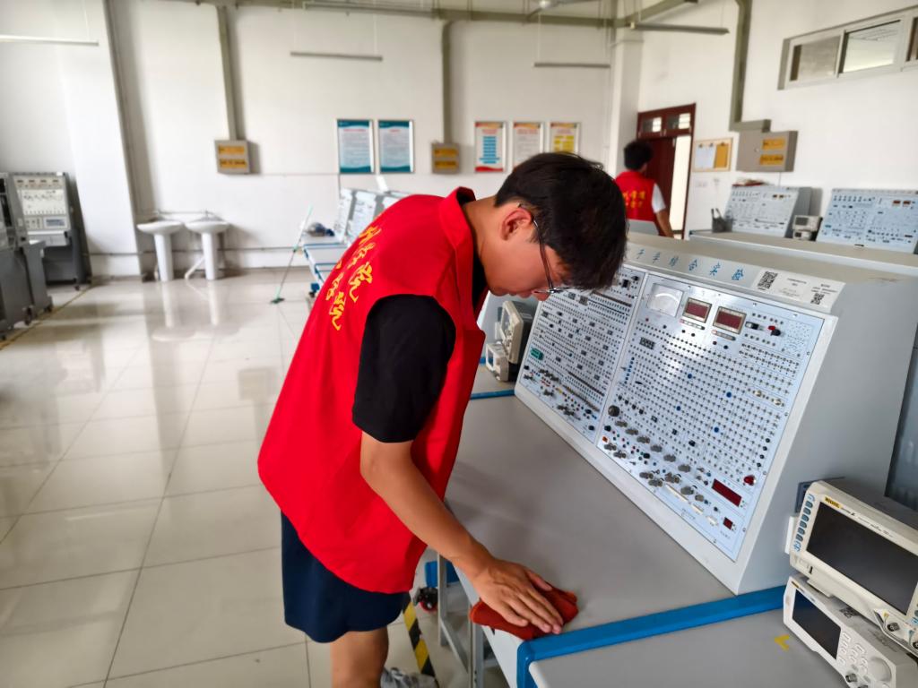 活动现场,学生会成员们热情高涨、分工明确,成员以部门为单位组建工作组,构建起高效协同的劳动体系。大家手持扫帚、抹布、水桶等工具,迅速投入劳动。同学们重新规划实验台布局,将零散摆放的器材分类归位,仔细擦拭设备表面灰尘;俯身清理地面杂物,用清洁剂去除顽固污渍,让地板光洁如新;还对门窗玻璃进行了细致擦洗。同时,大家对水电线路、消防设施等进行全面检查,及时排查潜在安全隐患,重点清理墙角、设备缝隙等卫生死角。