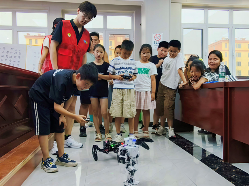 教室里的投影还未亮起,孩子们的目光已被讲台上两个“特殊嘉宾”吸引:一个是能稳稳走直线、甚至会各式各样动作的二足机器人,另一个是六足机器人,平稳快速的在地上爬行着。志愿者边调试着遥控器,边说道:“来给大家打声招呼”话音刚落,二足机器人随着音乐节拍晃动“手臂”,六足机器人则突然停下,对着前排的孩子“摆头”示意,惹得教室里爆发出一阵欢呼。