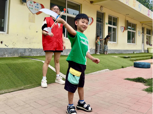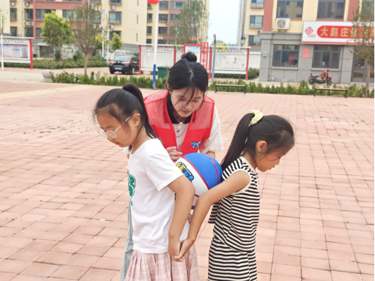体育活动展开时,整个院子瞬间变成沸腾的海洋。“背对背夹球跑”的赛道旁,两个扎羊角辫的小姑娘因为步伐不协调让篮球屡屡掉落,却始终没有松开相握的手。她们蹲在地上调整姿势时,额头渗出的汗珠在阳光下闪着光,重新站起时异口同声喊出的“一二一”,让在场的志愿者们不约而同鼓起掌来。这让我想起活动设计时查阅的资料:7-12 岁是儿童社交能力发展的关键期,双人协作运动能有效激活大脑的共情区域。看着孩子们从互不配合到默契十足,我真切感受到教育不是灌输,而是创造生长的土壤。