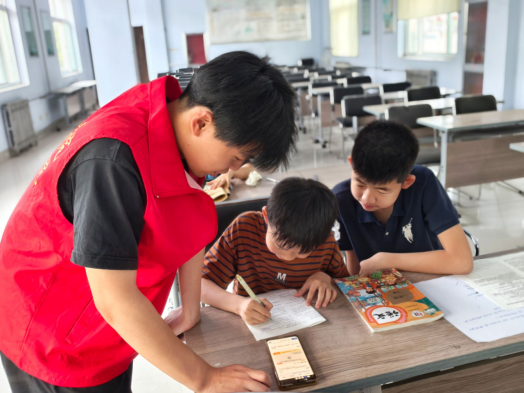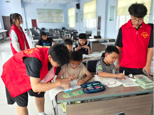 活动现场,志愿者们在社区为小朋友们提供全方位学习辅导。他们陪伴孩子们自主完成课业,逐份细致检查作业质量,针对数学应用题、语文作文等易错题型开展"一对一"精准辅导。创新实施"学科分段辅导+专项能力提升"模式,结合各年级知识难点,穿插数学速算技巧特训、语文阅读方法精讲等专题课程。通过设置"知识闯关""趣味问答"等互动环节,将枯燥的知识点转化为生动的学习游戏,让小朋友们在寓教于乐中夯实知识基础。