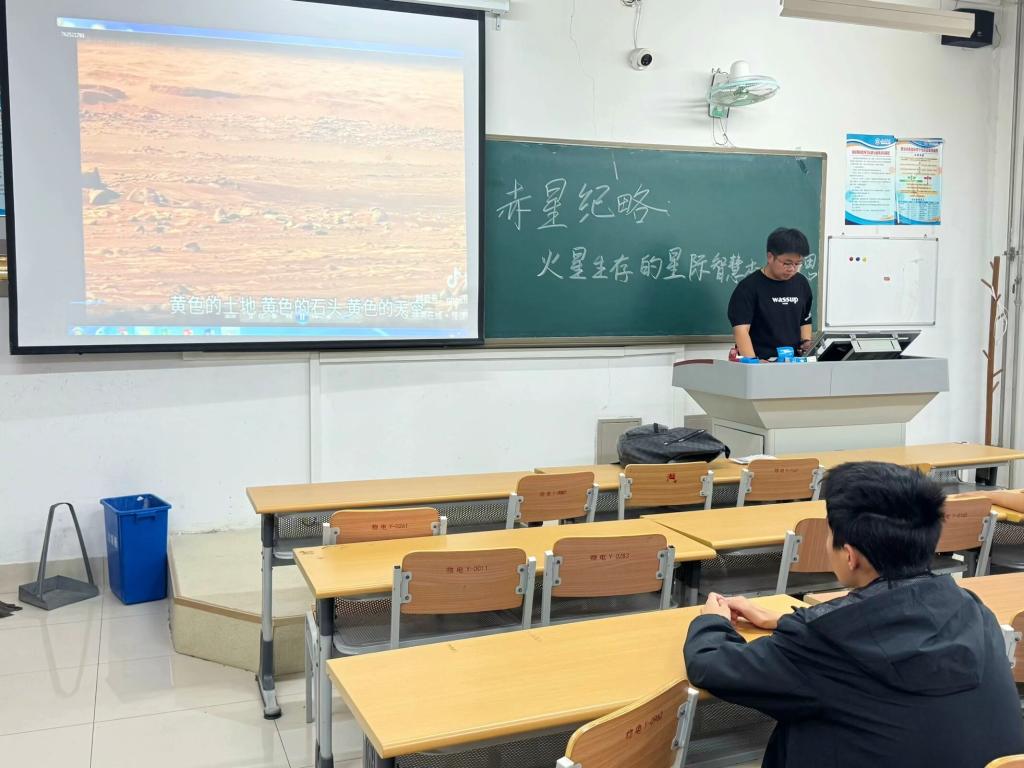 活动现场,主讲人以一段震撼的火星地貌视频开场,带领同学们开启星际探索之旅。从火星的基本概况切入,主讲人重点介绍了火星与地球的诸多相似之处:二者均存在四季更迭与昼夜交替,火星自转周期仅比地球多出41分钟,这种"时空共鸣"瞬间激发了同学们的探索热情。随后,主讲人以中国火星探测器"祝融号"的探索历程为线索,深入阐释人类探测火星的重大意义。他指出,作为距离地球最近的类地行星,火星不仅是研究太阳系形成演化的重要窗口,更可能蕴藏着地外生命的关键线索。同时,随着航天技术的发展,火星正逐步成为人类星际移民的潜在目的地,开展火星探测堪称人类迈向深空的里程碑。