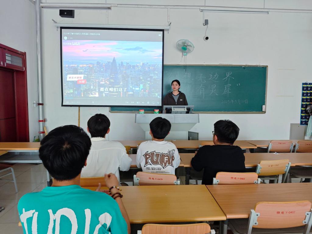 活动中,社团成员为同学们播放“中国的人形机器人”视频,通过“硬件架构-软件赋能-生态拓展”三位一体的视角,带领同学们走进智能机器人的奇妙世界。在硬件层面,主讲人详细解析了先进复合材料的运用与精密机械结构设计,展示了人形机器人高度灵活的关节系统如何突破传统机械限制,实现复杂动作的精准复刻与稳定执行。软件层面,依托先进人工智能算法与人机交互技术,人形机器人不仅具备强大的自然语言处理能力,更能通过深度学习持续优化交互逻辑,在教育、服务等多元场景中实现自然流畅的人机对话。此外,主讲人还重点介绍了人形机器人在智慧服务、教育陪伴等领域的应用实践,以及其与智能家居、办公系统互联互通构建的智能生态蓝图,让同学们直观感受到未来智能生活的无限可能。