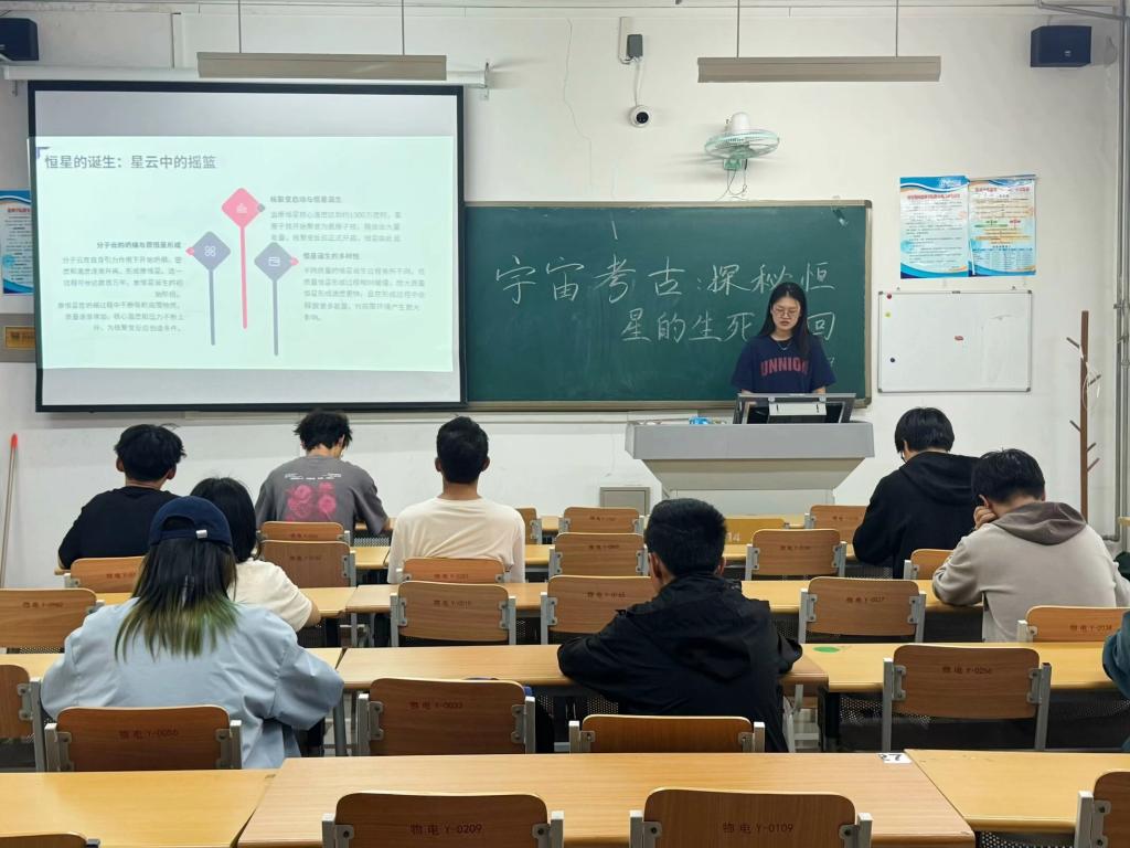 活动中,社团负责人从恒星的“一生”切入,系统讲解恒星从原恒星诞生、主序星稳定演化到红巨星膨胀、白矮星/中子星/黑洞终结的完整生命周期。随后以“化石宇宙学”为切入点,揭秘如何通过宇宙中的“时空化石”追溯星系演化历史并解析天文观测能力跃升的关键密码。最后,负责人围绕超新星分类及其对星际物质的重塑作用、神秘消失的800颗恒星现象,以及宇宙超级文明的科学猜想等前沿议题展开深度解读。互动环节中,同学们热情高涨,围绕恒星演化机制、超新星爆发原理等热点问题踊跃提问。社团负责人结合最新科研成果,以通俗化阐释与专业化解答相结合的方式,逐一回应同学们的疑问,现场洋溢着浓厚的学术思辨与科学探索氛围。