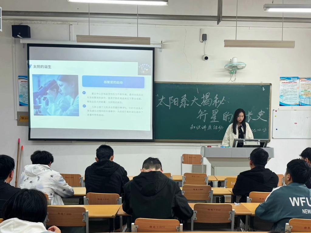 活动中,主讲人为同学们带来了一场名为“太阳的诞生”的精彩讲解,从行星的形成过程讲起,深入剖析了各行星的特别成长史,介绍了各类行星的特征和宇宙的奥秘。同学们全神贯注,被宇宙的奇妙深深吸引。随后,主讲人讲解了目前太阳系中的未解之谜人类努力探索的历史以及目前人类对未来太阳系的探索规划。活动还设置了“行星知识问答”互动环节,参与者踊跃提问,就“行星宜居性”“外星生命探索”等话题与主讲人展开讨论。