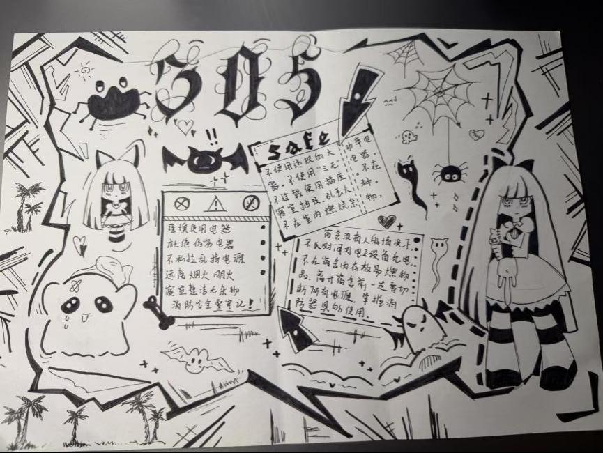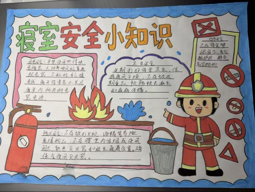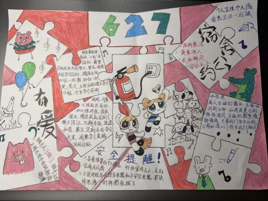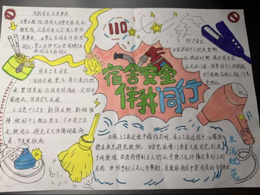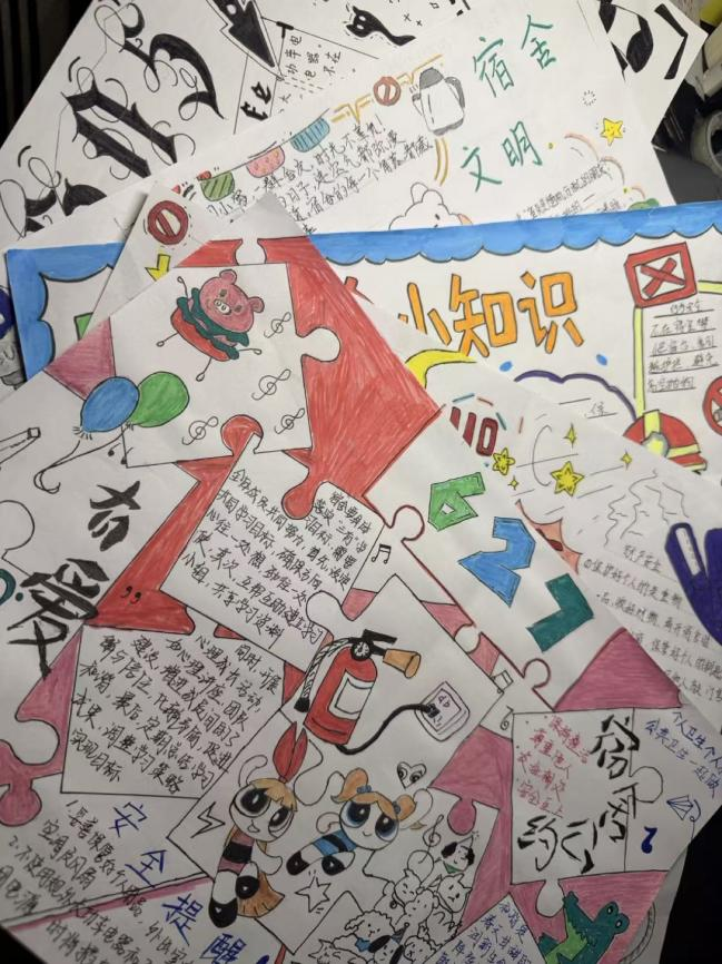 本次大赛围绕“宿舍文明、宿舍安全”两大主题方向,鼓励学生以宿舍为单位进行原创手绘创作,以手抄报形式倡导文明习惯、强化安全意识;在“宿舍文明”建设中,一张张精心绘制的手抄报成为传播文明公约的生动窗口。同学们以笔绘心、以图明理,图文并茂地诠释了如何共同制定作息时间、自觉维护公共卫生、用心营造尊重包容的室友情谊,将抽象的公约内化于心、外化于行。而在“宿舍安全”阵地上,手抄报则化身为普及知识的移动课堂与敲响警钟的视觉展板。创作内容深度融合实用知识与典型案例,从用电防火的规范到防范诈骗的要点,以生动直观的形式揭示风险、明确红线,让“安全无小事”的理念警钟长鸣、防线共筑。