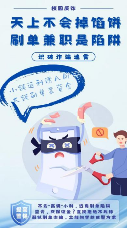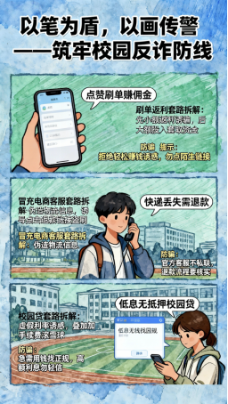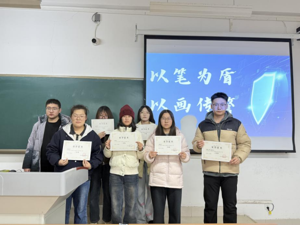 大赛以“反诈”为核心主题,聚焦电信诈骗、网络诈骗等高发类型展开创作,要求参赛者以手绘或电脑设计形式进行创作,作品需融入指定反诈元素并严守原创原则。而这一创作的过程,本身就是一场沉浸式的反诈学习:无论是独自构思的巧思,还是与同窗协作的火花,每一幅海报都成为拆解诈骗手段的生动载体,也让创作者在构思与落笔间,完成了一次反诈认知的自我深化,既梳理了反诈知识体系,更筑牢了防骗思想防线。通过这样的形式,学院也让学生从反诈知识的“被动倾听者”转变为“主动传播者”,让安全教育真正入脑入心。