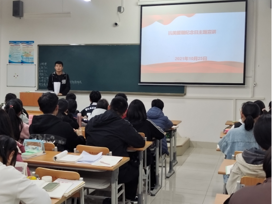 1950年10月25日,中国人民志愿军打响入朝后的第一次战役,以光荣的胜利拉开了伟大的抗美援朝战争的帷幕。为纪念抗美援朝出国作战71周年,再次回望半个多世纪前那段烽火连天的岁月,加深学生对抗美援朝历史意义和时代价值的认知,10月25日,beat365在线唯一官网在明理楼0227教室举办专题讲座。辅导员纪洪飞老师主讲,2021级新生与会聆听。