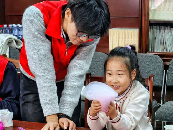 活动前期,志愿者团队提前规划流程,精心筹备实验材料,对纸巾、玻璃杯、水彩笔等材料进行安全检查,同时调试现场展示道具,确保活动顺利开展。活动现场,科普实验环节成为核心亮点,志愿者们以通俗易懂的语言讲解实验原理,带领孩子们动手参与“坚强的纸巾”“色彩接力”“泡泡龙”三个趣味实验。在“坚强的纸巾”实验中,孩子们亲手将纸巾塞入杯底、浸没水中,当发现纸巾保持干燥时,纷纷发出惊叹,志愿者随即以“空气屏障”为喻,解读大气压力的作用;“色彩接力”实验里,孩子们观察到颜色随水在纸巾上“爬升”,直观理解了毛细现象;“泡泡龙”实验中,大家用自制工具吹出连续泡泡,在欢乐中学习液体表面张力知识。活动临近结束,志愿者引导孩子们回顾实验过程,鼓励大家分享收获,现场互动氛围热烈。