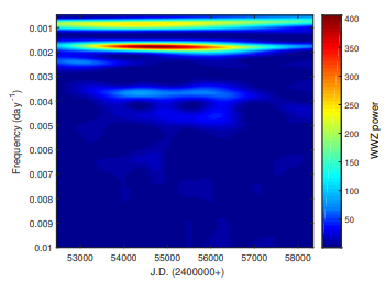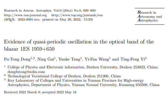 beat365在线唯一官网董富通博士等人整合了上海天文台、国家天文台及国际著名的天文观测数据库SMARTS等的观测数据,对blazar天体1ES 1959+650近16年的光学数据进行了分析,并发现准周期信号的存在。