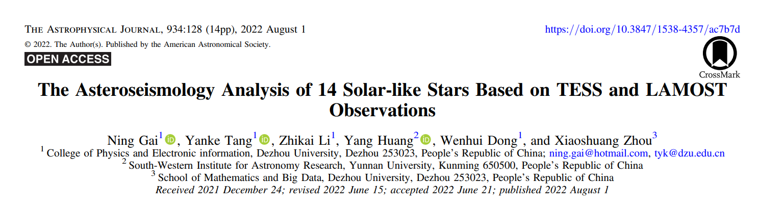 该研究成果发表在国际知名天体物理期刊《The Astrophysical Journal》上(IF:5.734,SCI Top期刊)。论文链接: https://iopscience.iop.org/article/10.3847/1538-4357/ac7b7d。