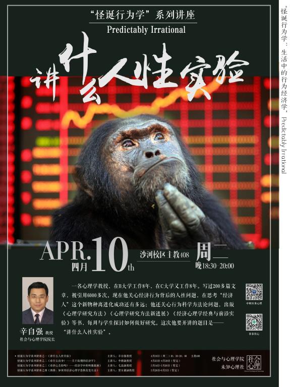 一名心理学教授,在B大学工作8年,在C大学又工作8年。写过200多篇文章,被引用6000多次。现在他关心经济行为背后的人性问题,在思考“经济人”这个新物种离进化成功还有多远;他还关心行为科学方法论问题,出版《心理学研究方法》《心理学研究方法新进展》《经济心理学经典与前沿实验》等书,每周与学生探讨如何做好研究。这次他要开讲的题目是——“讲什么人性实验”。