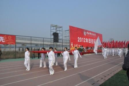 10月20日,我校迎来了2012年秋季运动会。本届运动会旨在丰富我校师生的体育文化生活,进一步推动“阳光体育”的实施,促进我校田径运动水平的提高。上午八十三十分,运动会开幕式正式开始。社会发展学院48名学生代表组成的方阵,身着红灰配色队服,象征着激情与友谊共存,祝愿运动会取得圆满成功。方阵同学头戴黄色或灰色帽子,组成“CUFE”四个字母造型,表达出作为中财人的骄傲与自豪。