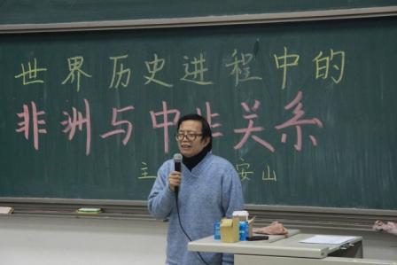 李安山教授曾到马达加斯加、乌干达、马里、肯尼亚、加纳、喀麦隆、坦桑尼亚、赞比亚、莫桑比克、意大利、澳大利亚、香港和台湾等地进行实地考察和参加学术会议。2000年曾作为中国教育部的特邀嘉宾参加“中非合作论坛·北京2000年部长级会议”。2002年作为访问学者曾在曼隆学院、斯坦福大学非洲研究中心、华盛顿大学、伊利诺大学非洲研究中心进行短期讲学,对非洲及中非关系有较为深入的研究与认识。在讲座中,李教授结合自己的研究,向同学们讲解了非洲的现状与中非关系的发展历程,并对中国在国际交往中的行为提出了自己的看法。讲座中,李教授与同学们进行了亲密的互动。同学们积极提出问题,李教授耐心解释,向同学们阐述了有关中非合作项目、非洲人民特点及中国人道主义援助等方面的内容。