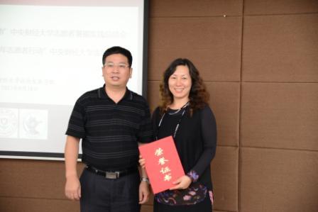 国家卫生计生委家庭司性别比治理办公室处长周恭伟向社会发展学院党总支书记姜涛授予2012年关爱女孩青年志愿者行动优秀组织奖