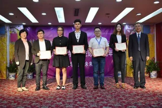 图二清华大学深圳研究生院党委书记、副院长武晓峰,台湾新竹清华大学学务长谢小芩为获得本届论坛一等奖的共五名同学颁奖(左二为杜小双同学)