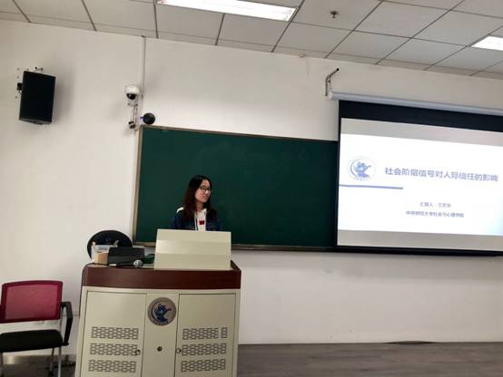兰艺华同学从如今的社会大背景引入,在越来越趋近“陌生人”社会的今天,人们每天需要面对更多的他人,接收并处理海量的信息,大大增加了人们的认知负荷,这使得人们在对接触到的人和事进行判断并做出决策时,越来越依赖能节省认知资源的直觉或自动化加工,这时社会阶层信号便发挥着减轻个体认知负荷的作用,由此引入研究主题。然后,兰艺华同学汇报了论文中的两个实验,分别研究了在社会交换视角和社会认同视角下社会阶层信号对人际信任的影响。研究表明,在如今越来越趋近陌生人社会的时代背景下,人们会通过感知到的社会阶层信号快速判断他人的社会阶层并决定自己与其交往的方式,其中,社会交换动机在社会阶层信号和人际信任中起到了完全中介效应。最后,兰艺华同学介绍我校研究生学术交流支持计划项目,为同学们今后的学术研究活动提供新渠道与新思路。