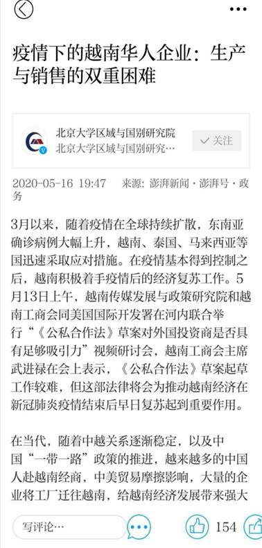 最近,350vip8888新葡的京集团2019级社会学专业硕士研究生安倩撰写的《疫情下的越南华人企业:生产与销售的双重困难》发布于“澎湃新闻·澎湃号·政务”中的“再看世界”(Area Observer)专题中。文章由该生导师包胜勇副教授指导。5月份以来,越南的疫情基本得到控制,越南政府积极着手疫情后的经济复苏工作。疫情下在越南生活的华人生活工作状况也引人关注。在安倩同学的越南疫情观察报告里,介绍了两位在越南发展的华人的经历和所见所闻。文章以小见大,引导读者深入了解疫情下越南华人企业的生存困境。