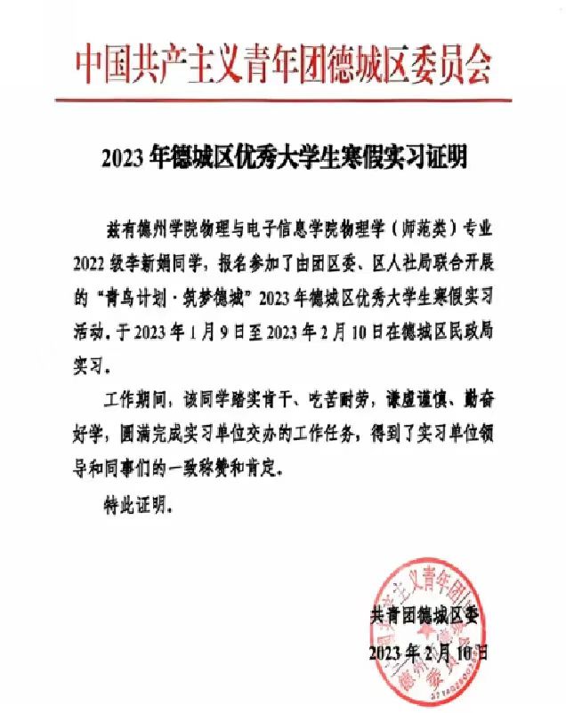 在实践方面,李新娟志愿投身实践服务,在奉献中展现青春色彩。作为班级团支书,她结合师范专业特色,建立“科学小讲堂”宣讲团,带领团支部在妇女儿童活动中心、石家园社区等开展科学小讲堂,在课余时间共参加公益志愿服务活动40余项。同时她积极参加暑期三下乡社会实践活动,来到聊城莘县开展乡村振兴志愿服务活动,将每一次活动用相机和文字记录,为乡村振兴贡献自己的青春力量。她还参加了青鸟计划大学生返家乡社会实践活动,在德城区民政局参加实习,因优异表现被共青团德城区委聘任为青鸟驿站副站长,锻炼自己的同时,丰富了自己的阅历。