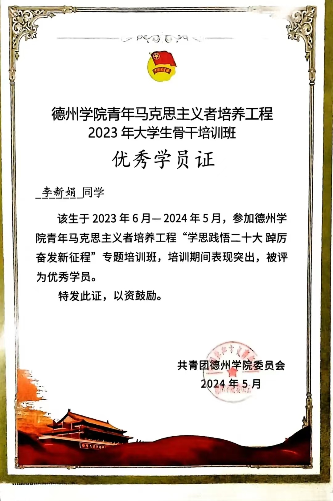 在思想方面,李新娟有着坚定理想信念和政治方向,积极向党组织靠拢,不断学习党的先进理论知识,大二成为一名光荣的中共党员。作为一名学生干部,她充分发挥先锋模范带头作用,关心同学,协助老师们开展工作。同时不断提高自身素养,积极参加德州学院青马工程培训,荣获青马班优秀学员称号;作为学生代表参加共青团德州学院第二次代表大会暨德州学院第五次学生代表大会,更好的为同学们办实事。