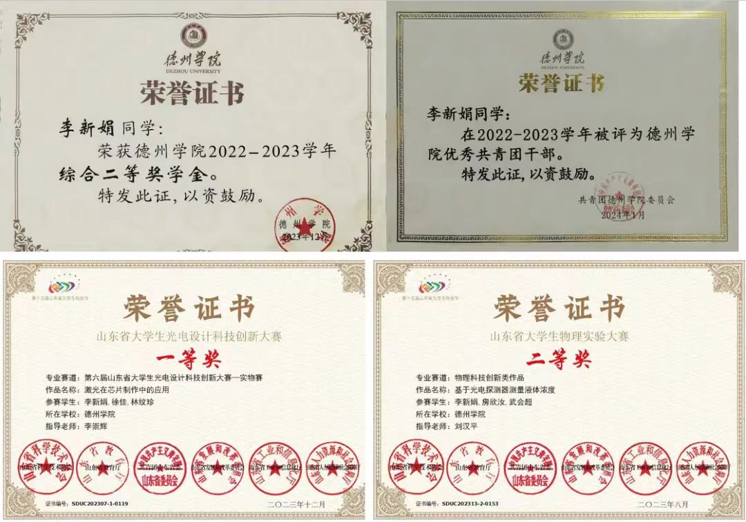 如果说学习是大学生活的主旋律,那么科研竞赛就是她挑战极限、超越自我的重要途径。在科创方面,脚踏实地,仰望星空一直激励她不断前行,作为主持人获得2024年大学生创新创业训练计划省级立项,并且参加德州学院山东省生物物理重点实验室。她还积极参加物理实验竞赛,如大学生光电设计大赛,物理讲课比赛等,共获得省级荣誉7项。无数次挑灯夜读,无数次奋笔疾书,以灯火为伴,与星辰对话,她于德州学院学报上发表两篇论文,是对崇德启智,励志博学的生动诠释。
