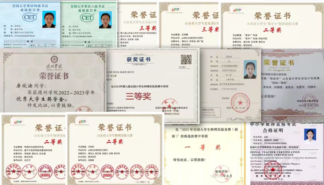 从大二开始,房欣汝便投入到学术竞赛中,始终紧跟随指导老师的步伐。备赛期间,她对作品反复推敲,不断打磨,力求尽善尽美。凭借着不懈的努力,她最终获得了第九届全国大学生物理实验竞赛国赛三等奖、山东省大学生物理实验大赛二等奖、山东省大学生物理实验竞赛(实物类)二等奖、山东省大学生“数字+”创新创业大赛二等奖等奖项,同时她与团队成员共同努力,获得了省级大创项目,她还获得了山东省师范类学生从业技能大赛高中物理组种子选手的资格。这些经历犹如璀璨星辰,极大地丰富了她的大学画卷,更如同磨刀石一般,磨砺着她。