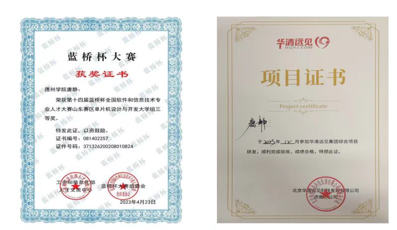 在课余时间,唐静积极参加专业科技竞赛和创新创业活动,在竞赛中,尽可能将所需要将所学的专业知识融入到项目之中,学以致用,融会贯通,同时不断学习新知识与新技能,进一步充实提高。曾获山东省大学生物理实验大赛省级一等奖、中国高校智能机器人创意大赛省级二等奖、第十届“大唐杯”全国大学生新一代信息通信技术大赛省级二等奖、中国大学生计算机设计大赛省级三等奖、全国大学生电子设计竞赛省三等奖等省级奖6项、校级奖8项。