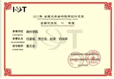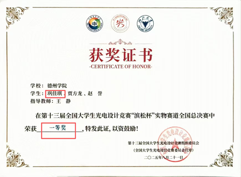 敢闯敢试,勇攀高峰,巩佳琪同学深知“实践出真知”,积极投身科技竞赛领域,凭借扎实的专业功底与团队协作能力屡创佳绩。她所在的队伍共斩获国家级奖项五项——其中,在全国大学生光电设计大赛中,他们作为山东省唯一入围国赛的队伍,一路过关斩将夺得全国一等奖;在全国大学生物联网设计大赛中再获全国一等奖,在全国大学生电子设计竞赛、计算机设计大赛中分别斩获全国二等奖。此外,她还参与研究并发表两篇软件著作权,累计获得省校级以上奖项20余项,用创新成果诠释了新时代大学生的科创担当。
