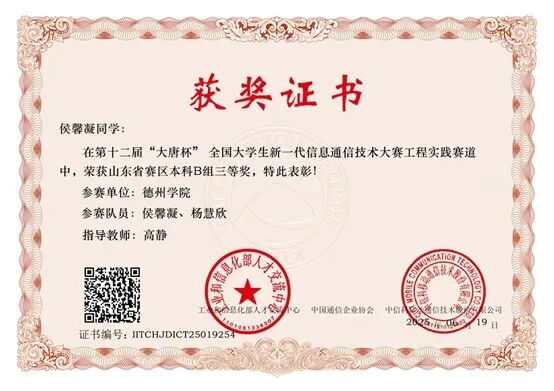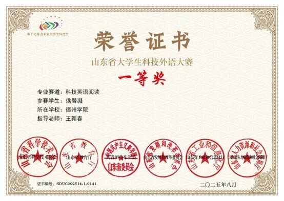 积极参与各类英语竞赛,在“山东省大学生科技阅读大赛””外研社国才杯””外教社词达人杯”多类赛事中展现出较强的英语能力,获得省校级奖项十余项。获得2025全国高校商业精英挑战赛全国一等奖、“大唐杯”全国大学生新一代信息通信技术大赛省三等奖、2024中国国际大学生创新大赛校一等奖等竞赛奖项。体育竞赛方面,2023年德州学院排球联赛女子第7名、体育嘉年华排球垫球王一等奖、冬季越野赛团队二等奖。