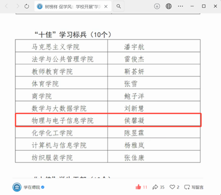 大一学年,侯馨凝学习成绩与综合成绩均位列专业第一,综合成绩91.86分。单学期最高学分绩点达4.27。荣获 2023-2024学年国家励志奖学金与德州学院优秀大学生奖学金。大二学年开始辅修法学双学位,法学成绩位于双学位班前两名。先后考取了C1驾驶证、普通话二甲、初级会计、英语四级、计算机二级、英语六级,努力向复合型人才迈进。入学以来所有科目绩点3.83,绩点排名居专业第一,斩获2024德州学院“十佳学习标兵”、2024-2025 学年国家奖学金。