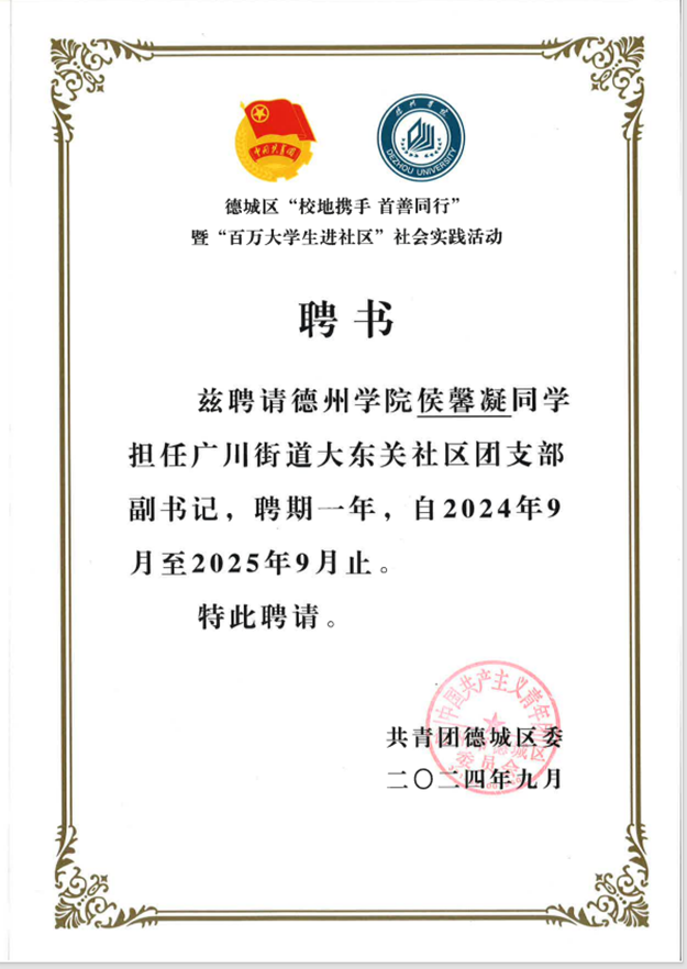 她曾在“一站式”学生社区与事务发展中心担任活动部干事,参与各类活动的组织策划;同时热爱志愿服务,多次参与学院青志部活动,并动员团支部团员投身志愿工作;担任过德城区广川街道大东关社区兼职团干部,搭建学校与社区的沟通桥梁。参与2025大学生返家乡社会实践,服务于平度市环境生态局。2025年 4月,在学院统一安排的综合工程实训中表现出色,获评优秀学员。侯馨凝积极参与运动会、越野赛、辩论赛、演讲比赛等各类文体活动,多次荣登beat365在线唯一官网官方公众号、传递榜样力量、书写多维青春。