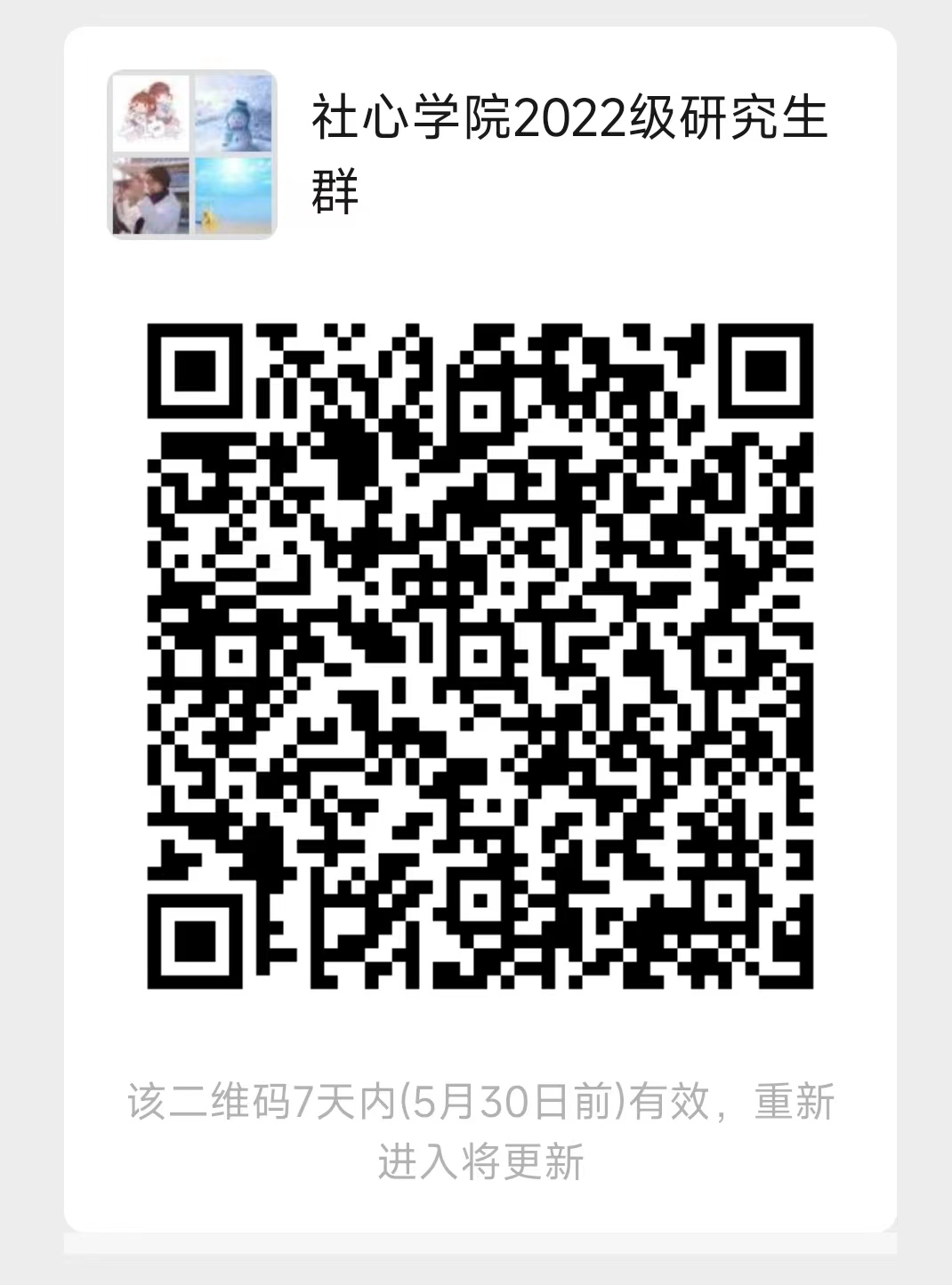因近期有许多同学咨询档案转寄及其他入学相关事宜,为方便解答大家的疑问,学院特建立社心学院2022级研究生微信群,请大家扫码入群。