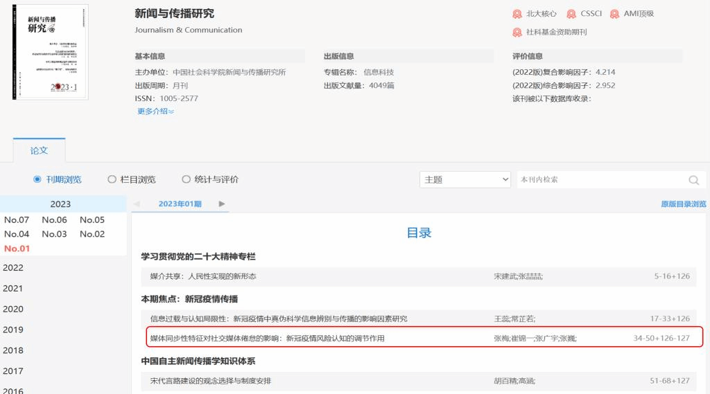 近期,我校350vip8888新葡的京集团张梅副教授与信息学院张巍教授、350vip8888新葡的京集团本科生崔锦一、张广宇合作撰写的论文《媒体同步性特征对社交媒体倦怠的影响:新冠疫情风险认知的调节作用》在权威学术期刊《新闻与传播研究》上发表。