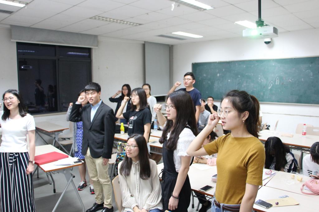 晚上7点,主题党日活动正式开始。第一个环节是老党员重温入党誓词活动。随着乐声庄严响起,2014级本科生党支部周艾佳同志领誓,全体党员重温了入党誓词。誓词重温,承诺未改,从大家笃定的眼神和铿锵的语调里,感受到了作为一名党员的承诺与担当。
