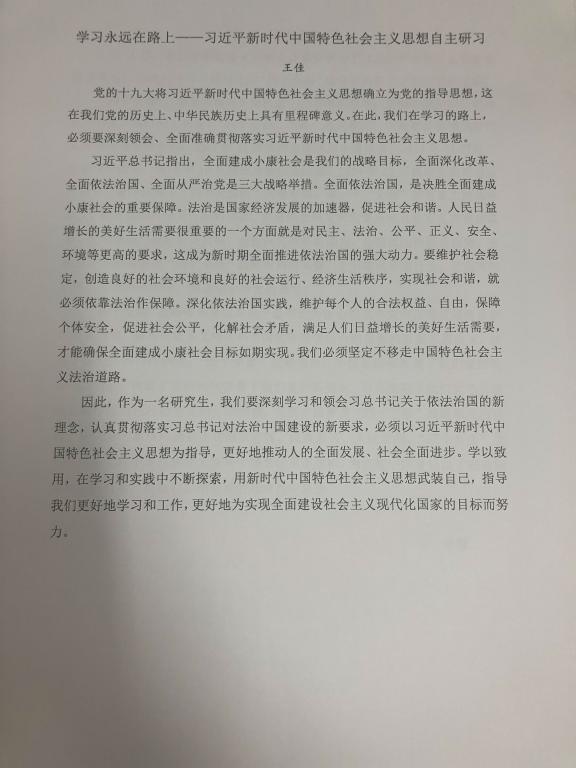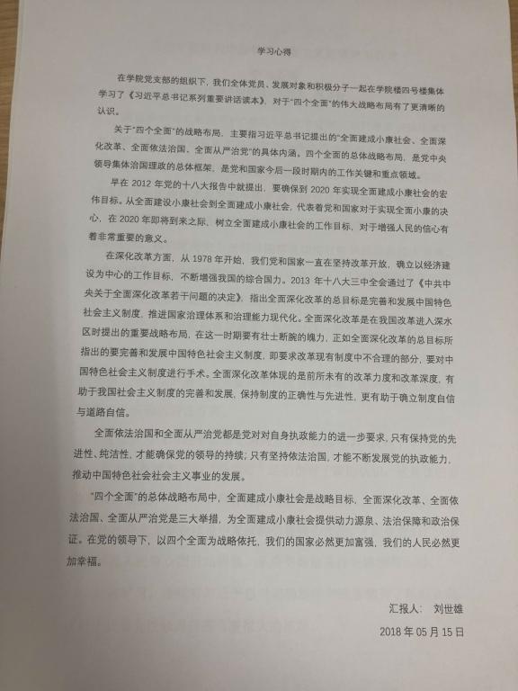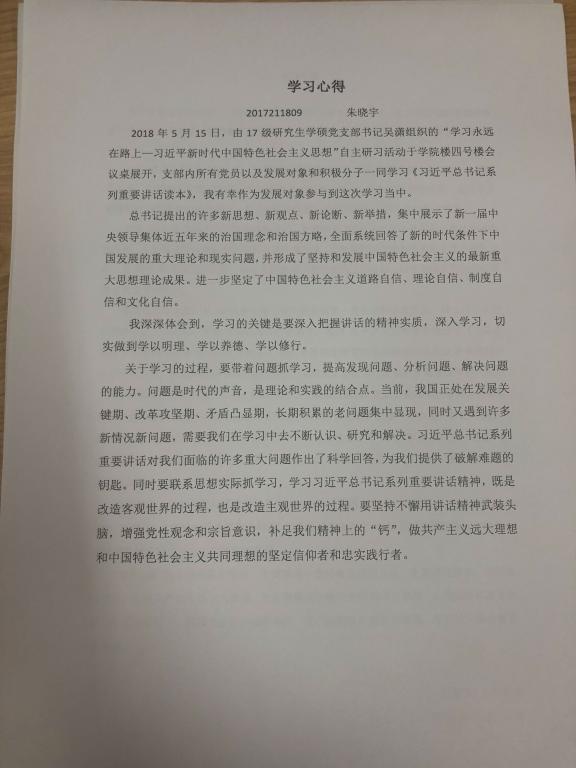 为深入学习贯彻习近平新时代中国特色社会主义思想和党的十九大精神,结合当前个人思想、工作实际,提高党员同志对习近平新时代中国特色社会主义思想的认识,我们全队组织成员于2018年515日在学院楼四号楼会议桌开展“学习永远在路上·习近平新时代中国特色社会主义思想自主研习”活动。