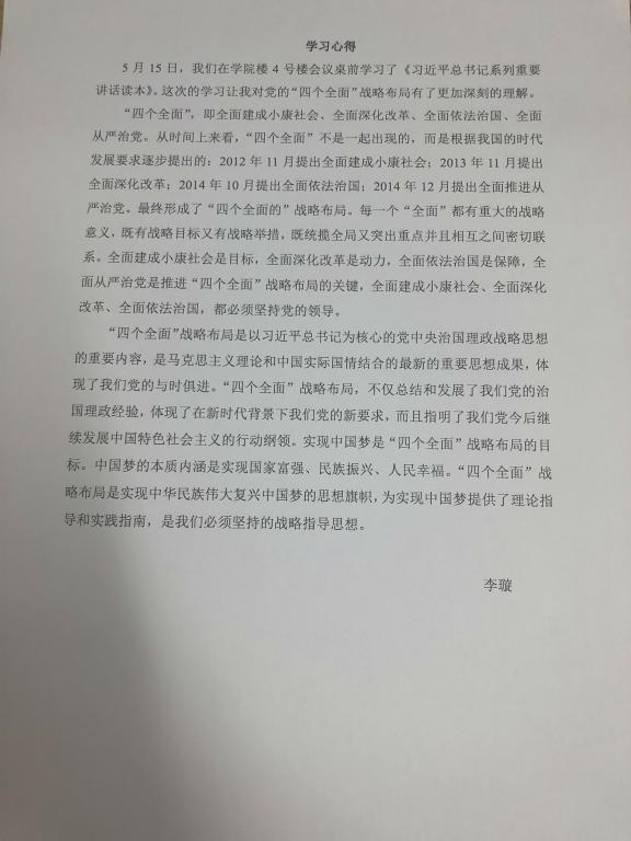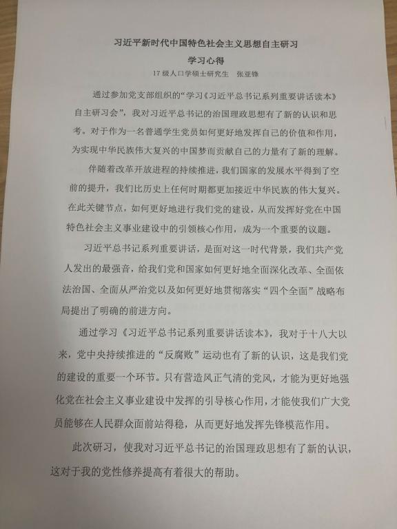 在此次主题活动中,组织成员学习《习近平总书记系列重要讲话读本》,党员同志就自己的学习心得进行分享,刘央同志表示,勤学、修德、明辨、笃实就是耳提面命的警钟,也在时刻指导着个人的生活。自己每时每刻的奋斗,每个阶段的选择都受着这样价值观的引领。作为新时代青年,作为一名人口学专业的研究生学子,更要尽力补充自己的学识,为社会所用,以能够贡献自己的社会价值为个人追求。张亚锋同志表示,通过学习《习近平总书记系列重要讲话读本》,对于十八大以来,党中央持续推进的“反腐败”运动也有了新的认识,这是党的建设的重要一个环节。只有营造风正气清的党风,才能为更好地强化党在社会主义事业建设中发挥的引导核心作用,才能使我们广大党员能够在人民群众面前站得稳,从而更好地发挥先锋模范作用。同样,李璇同志加深了对“四个全面”战略布局的认识,认为 “四个全面”战略布局,不仅总结和发展了我们党的治国理政经验,体现了在新时代背景下我们党的新要求,而且指明了我们党今后继续发展中国特色社会主义的行动纲领。实现中国梦是“四个全面”战略布局的目标。刘世雄同志通过此次研习,对习近平总书记的治国理政思想有了新的认识,这对于个人的党性修养提高有着很大的帮助,表达了只有在落实“四个全面”战略布局的基础上,我们广大青年才能在新时代能够有所作为,能够更好地将个人利益与国家利益相结合,更好地实现自我价值和社会价值的有机统一。朱晓宇表示深深体会到,学习的关键是要深入把握讲话的精神实质,深入学习,切实做到学以明理、学以养德、学以修行。王佳同志认为作为一名研究生,我们要深刻学习和领会习近平总书记关于依法治国的新理念,认真贯彻落实习近平总书记对法治中国建设的新要求,必须以习近平新时代中国特色社会主义思想为指导,更好地推动人的全面发展、社会全面进步。学以致用,在学习和实践中不断探索,用习近平新时代中国特色社会主义思想武装自己,指导我们更好地学习和工作,更好地为实现全面建设社会主义现代化国家的目标而努力。此次自主研习活动让每一位同志都收获颇多。